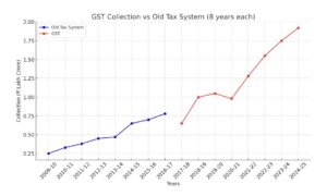 • 2017–18 से 2024–25 तक (8 साल) GST संग्रहण ~ ₹118–119 लाख करोड़।